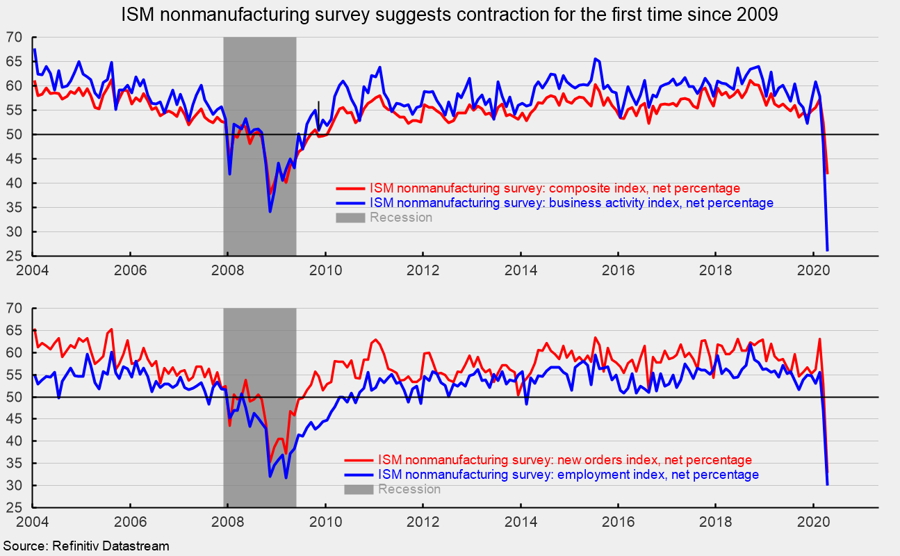 The Institute for Supply Management’s nonmanufacturing index dropped to a reading of 41.8 in April from 52.5 in the prior month. The April result is the first below the neutral 50 threshold since December 2009 and the lowest result since March 2009 during the Great Recession (see top chart). Readings above 50 suggest expansion for the nonmanufacturing sector and historically, readings above 48.5 have suggested expansion of the overall economy. The April figure ends a run of 122 months of expansion for the sector and 128 months of growth for the economy. The latest results are also in line with the manufacturing survey that also were well below neutral.