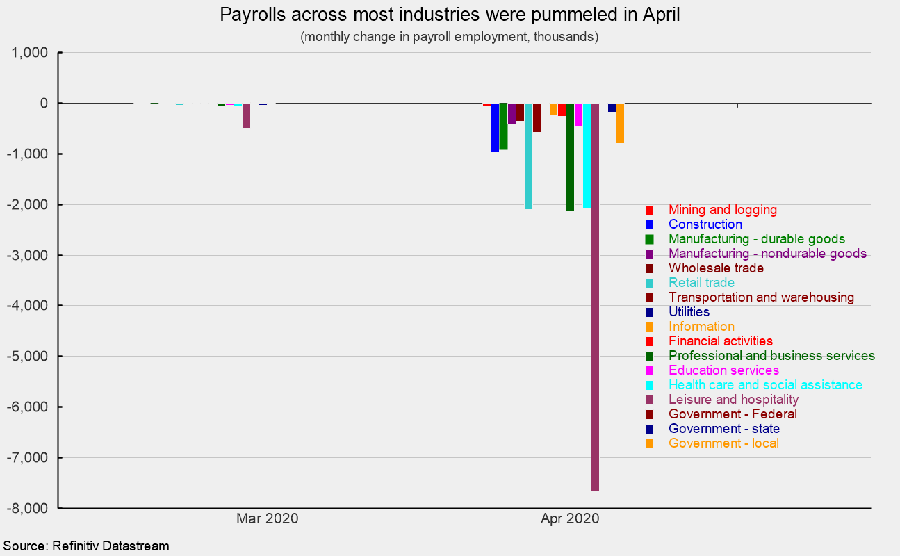 While the magnitudes of the declines are staggering, the breadth is also shocking. Measured on a percentage basis, all of the 14 private-sector industry categories posted declines in April, with 12 of them showing a decline of at least 5 percent. By far, the worst decline was a 46.8 percent drop in leisure and hospitality. (see second chart).