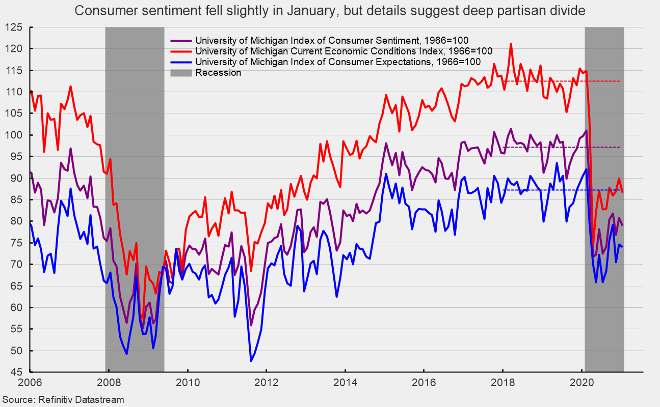 The final January results from the University of Michigan Surveys of Consumers show overall consumer sentiment fell in January and remains well below pre-lockdown levels, though well above prior cyclical lows. Despite the small decline, the details show deep partisan differences, especially for consumers’ expectations.