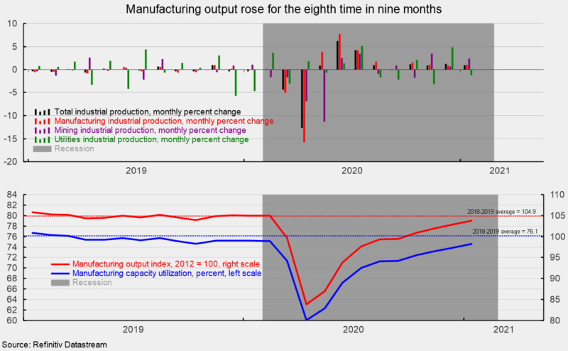 January data suggest that manufacturing output continues to recover but that output and utilization remain slightly below pre-pandemic levels. The combination of the ongoing distribution of vaccines, declining cases of Covid-19, and easing of government restrictions on consumers and businesses is helping support the continued rebound in manufacturing output. The positive momentum needs to be sustained and spread to other areas such as the labor market before an all-clear signal can be issued, but the continued recovery in manufacturing is a favorable sign.