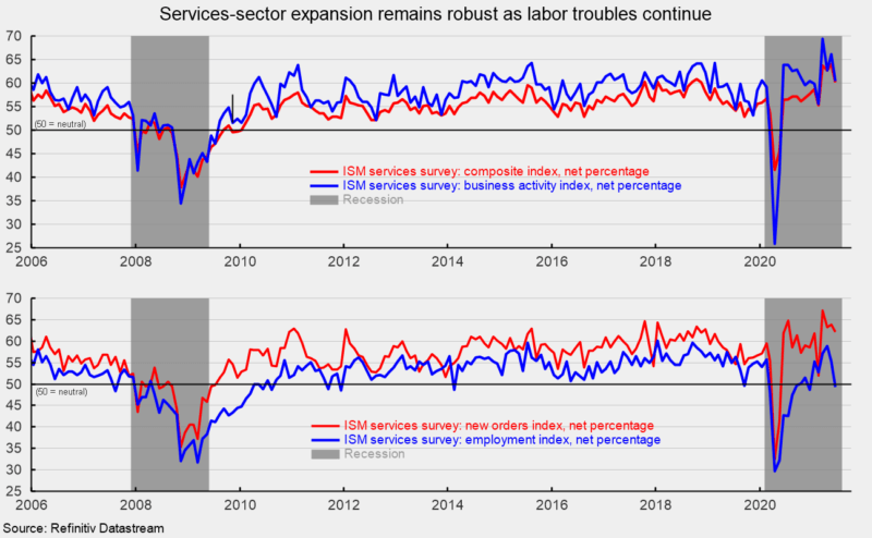 The latest report from the Institute of Supply Management suggests that the services sector and the broader economy expanded again in June. Several respondents to the survey mentioned robust levels of activity but also increased price pressures and materials shortages, particularly related to supply chain, logistics, and transportation issues as well as labor difficulties. Overall, the outlook remains tilted to the upside.
