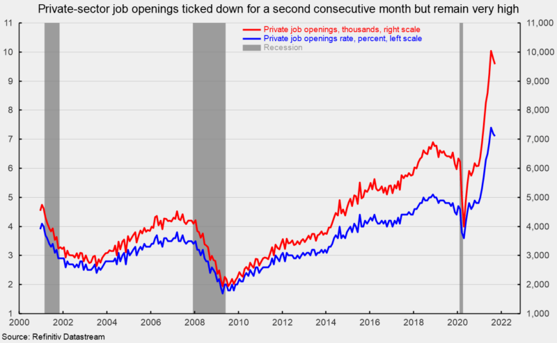 The latest Job Openings and Labor Turnover Survey from the Bureau of Labor Statistics shows the total number of job openings in the economy fell to 10.438 million in September, down from 10.629 million in August. The number of open positions in the private sector decreased to 9.581 million in September, down from 9.775 million in August (see first chart). Despite a second consecutive month of decline, total and private sector openings remain extremely high by historical comparison.