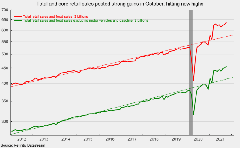 Retail sales and food-services spending rose 1.7 percent in October following a 0.8 percent gain in July and a 1.2 percent increase in August. The three-month annualized growth rate over that span is a very strong 15.8 percent. The increases put total retail sales at a new record high and well above the pre-pandemic trend (see first chart).