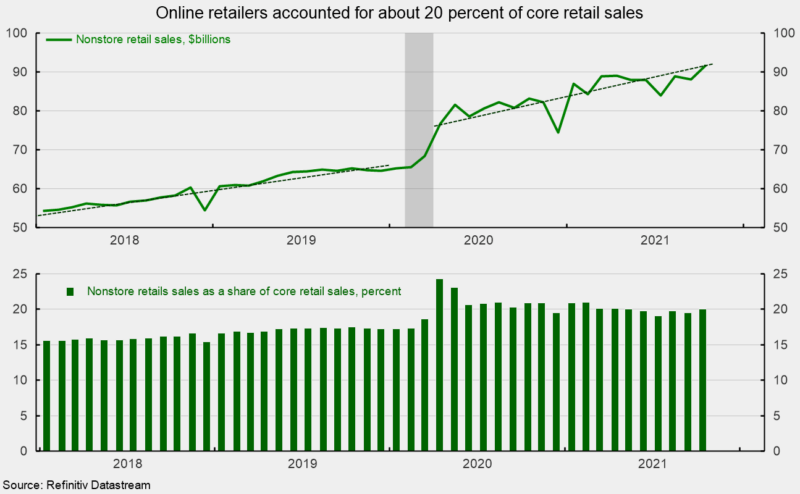 Nonstore retailers had been growing at a strong rate prior to the pandemic (9.1 percent annualized over the ten years through December 2019; see top of third chart). However, over the past 18 months, the annualized growth rate accelerated, hitting an extraordinary 12.7 percent as of October (see top of third chart). The strong performance has pushed the nonstore sales share of core retail sales from 17.2 percent for December 2019 to 20.0 percent for October (see bottom of third chart).