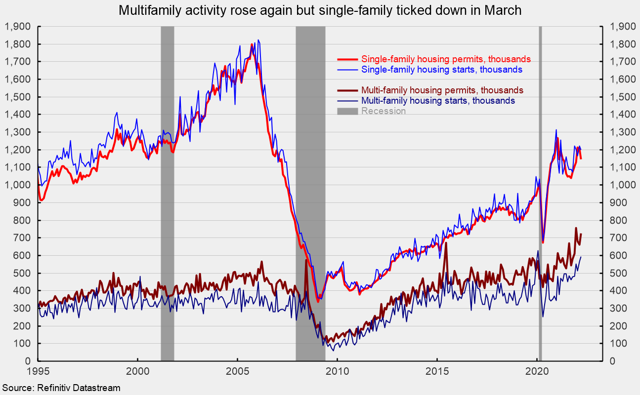 Total housing starts rose to a 1.793 million annual rate in March from a 1.788 million pace in February, a 0.3 percent increase. From a year ago, total starts are up 3.9 percent. Total housing permits also rose in March, posting a 0.4 percent gain to 1.873 million versus 1.865 million in February. Total permits are up 6.7 percent from the March 2021 level. Both categories were led by multifamily housing.