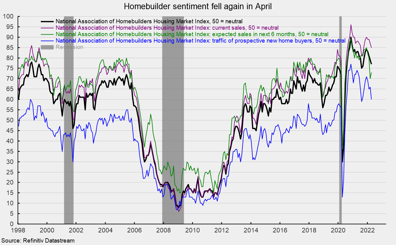 Two of the three components of the Housing Market Index fell in April. The expected single-family sales index rebounded slightly, rising to 73 from 70 in the prior month, but the current single-family sales index was down to 85 from 87 in March while the traffic of prospective buyers index fell six points to 60 (see second chart).